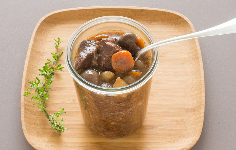 Le bourguignon de bœuf se dresse avec des chips de carottes cuites sur la plaque du four et saupoudrées de fleur de sel. Vous apprécierez ainsi le contraste audacieux entre la tendresse des ingrédients traditionnels et le craquant de la modernité.